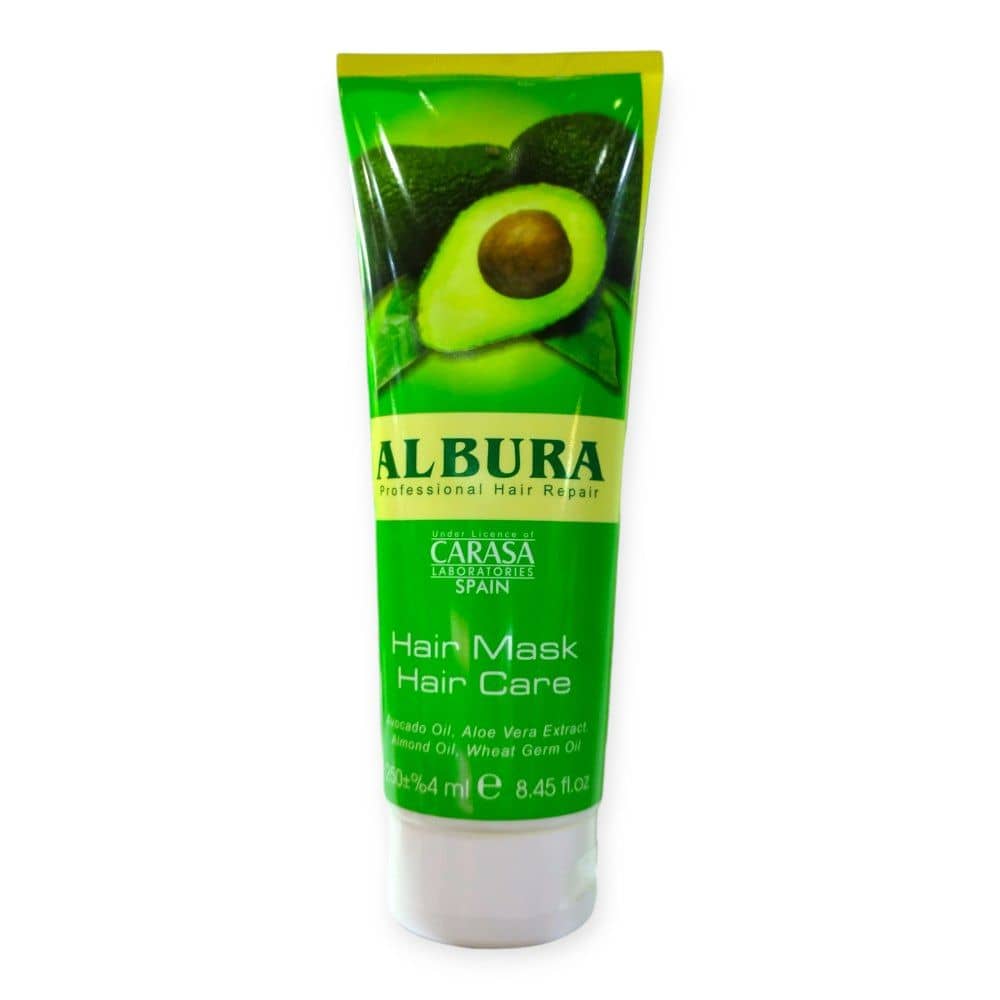 ماسک مو آووکادو البورا تحت لیسانس شرکت Carasa اسپانیا می باشد. از این ماسک مو جهت ترمیم موهای خشک و آسیب دیده استفاده می گردد. این ماسک موی آلبورا حاوی روغن آووکادو، روغن آلوئه ورا، روغن بادام و عصاره جوانه گندم می باشد که باعث نرمی و براق شدن مو و استحکام بخشی و تجدید حالت اولیه مو می شود.